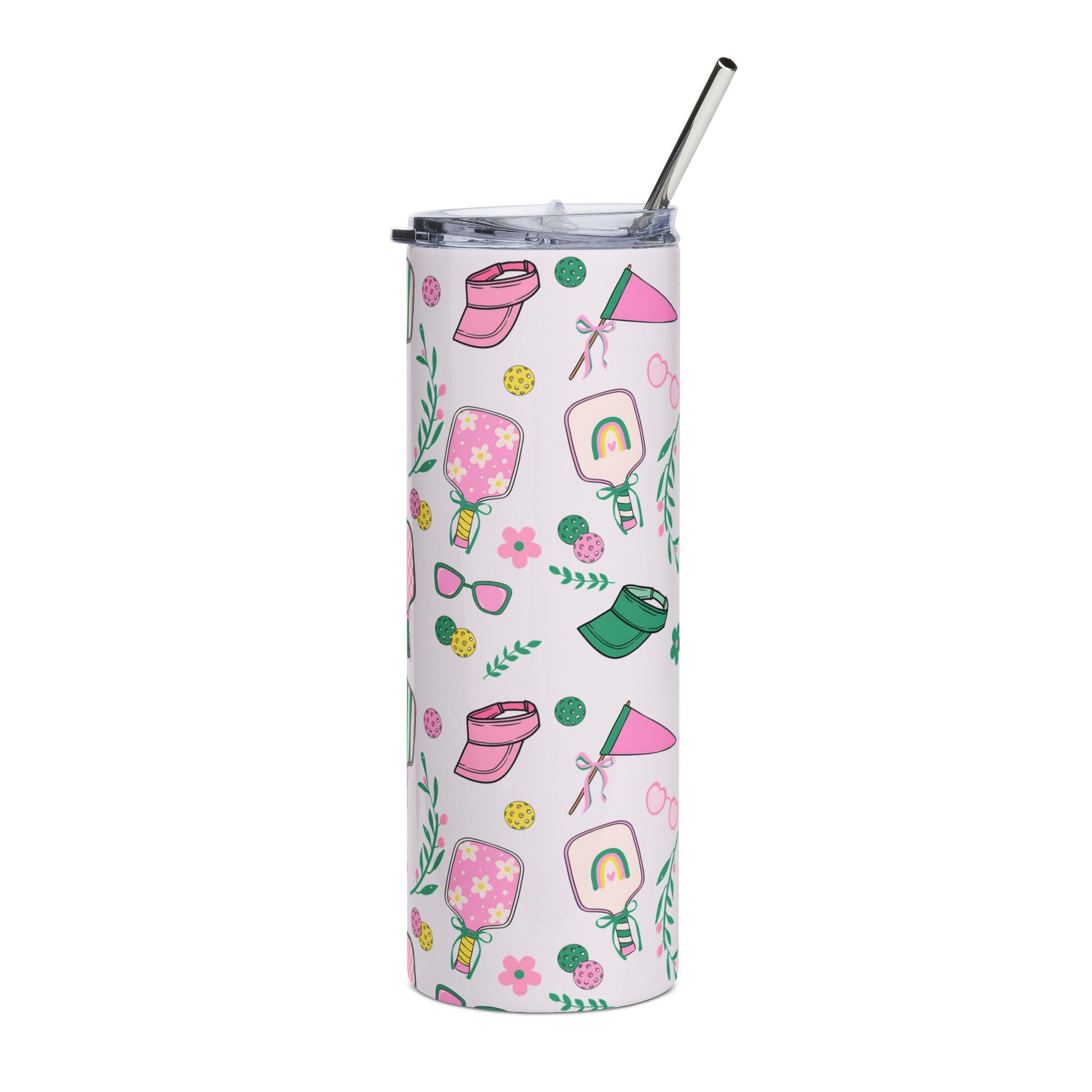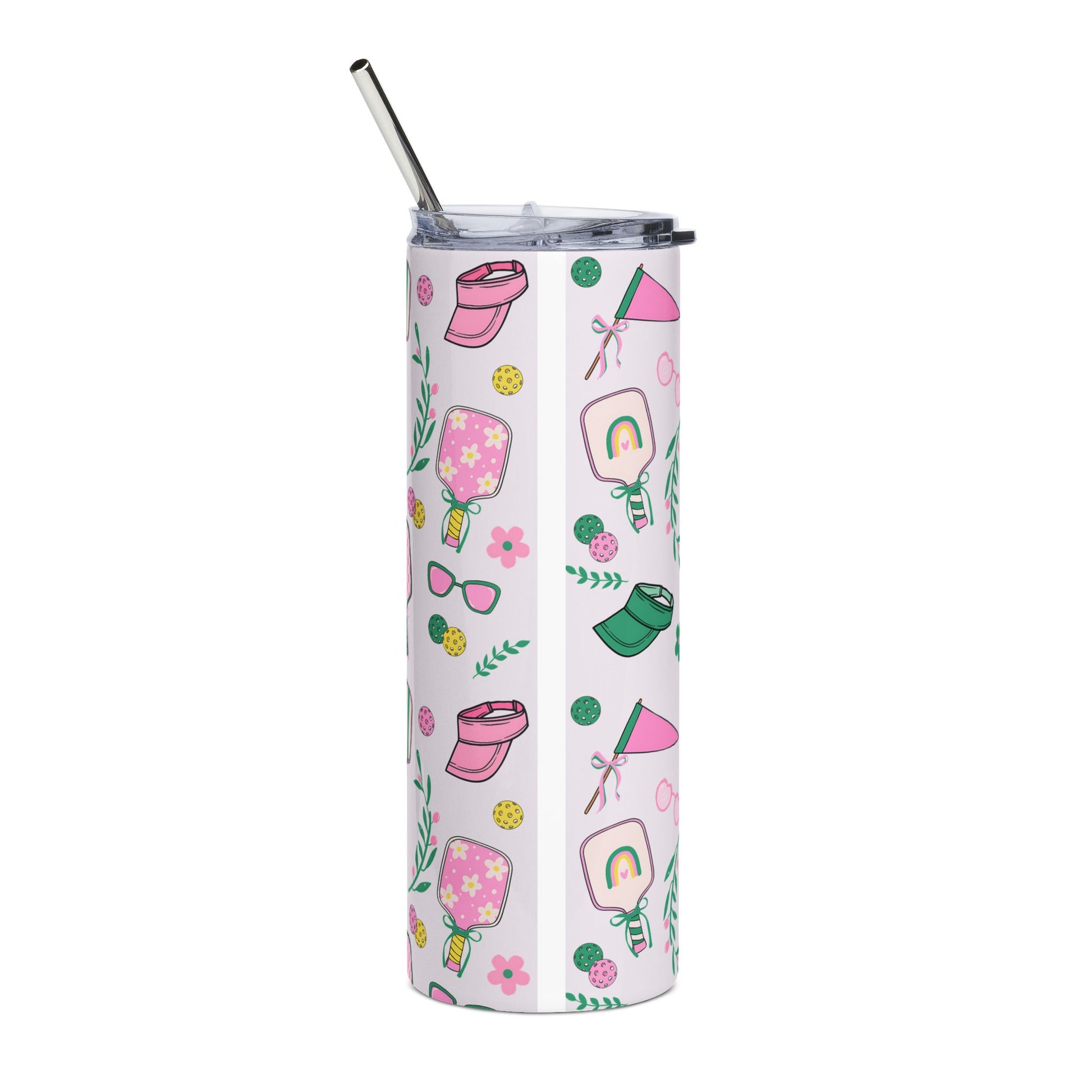 Bright, slim, and ready for sunny days — this 20 oz stainless steel tumbler carries playful summertime energy in a durable, travel-friendly design. Hand-drawn paddles, sunglasses, sun hats, little flowers and ice pops dance around a clean white backdrop, giving every sip a cheerful, beach-cabana feeling. The glossy protective varnish keeps the colors vibrant while the high-grade stainless steel body resists rust and daily bumps. Use the included clear lid and metal straw to sip cold drinks on the move — from poolside afternoons to long walks to the pier. Lightweight and cylindrical, it slips easily into narrow cup holders and tote pockets, adding a splash of hand-illustrated charm to routine refreshment.