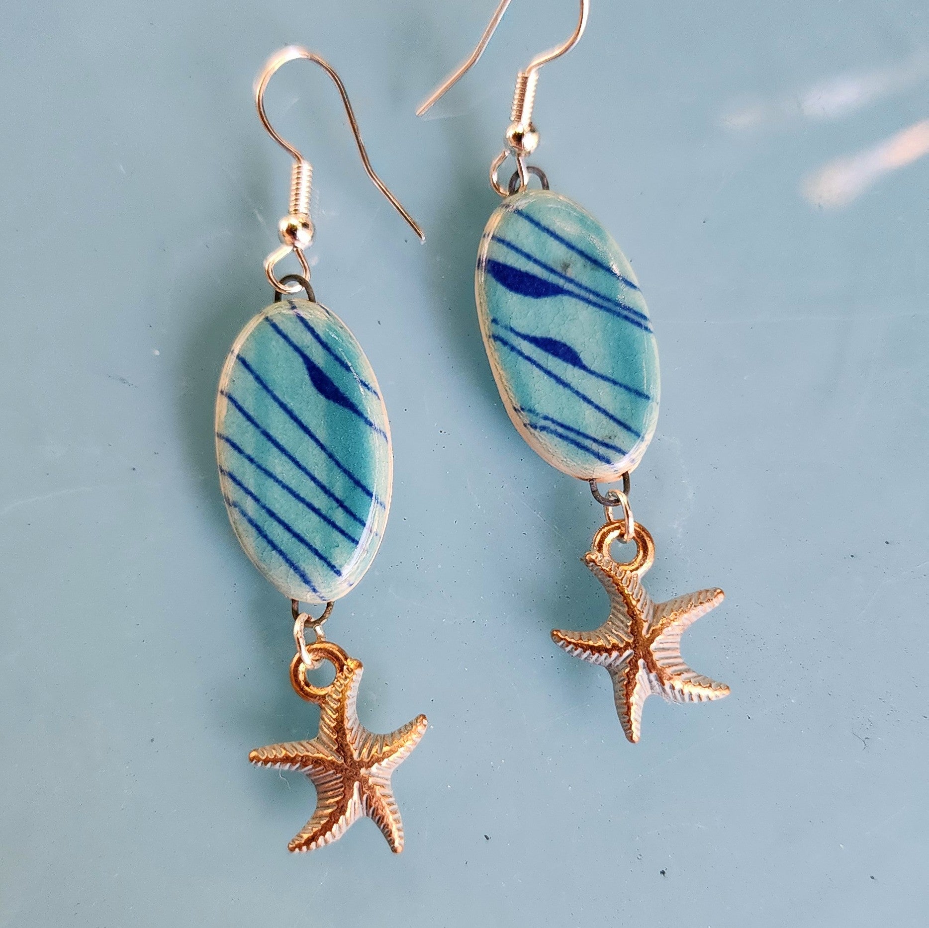 Ceramic abstract earrings with metal starfish charm dangle earrings. Measures approximately 2.5 in