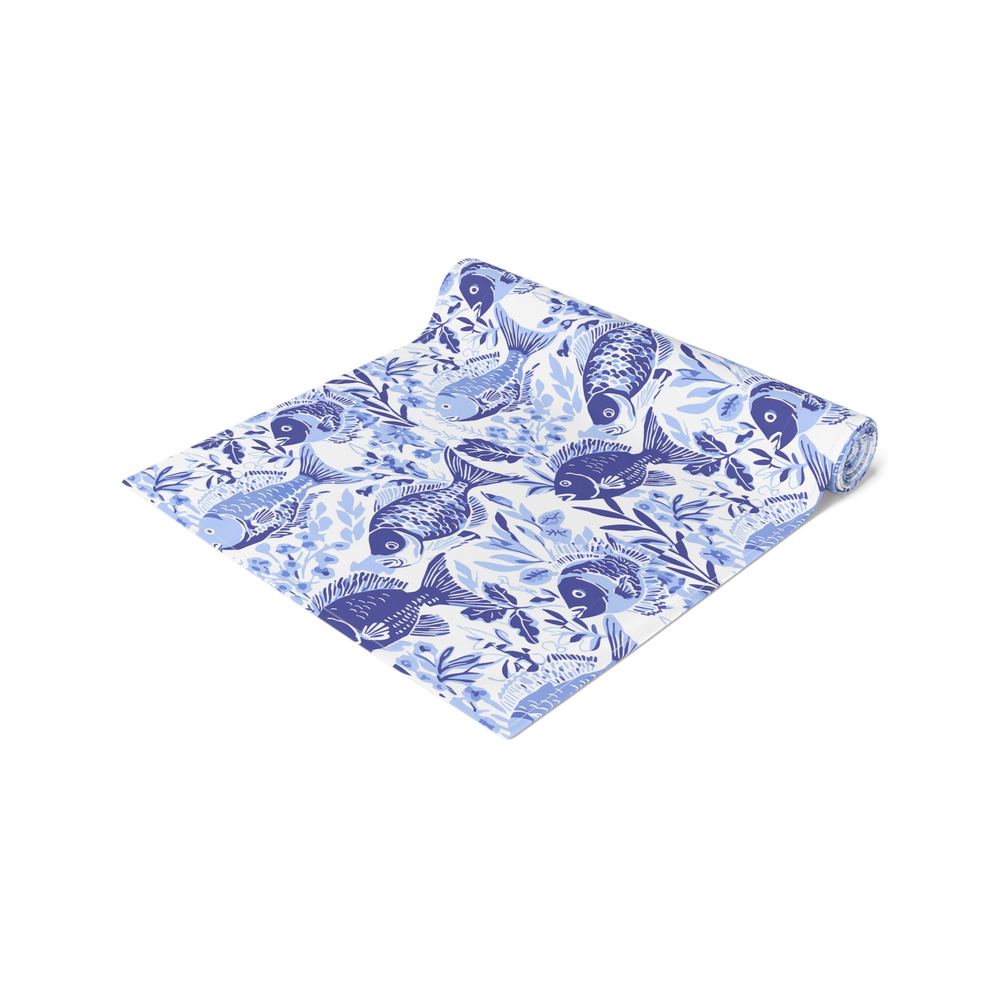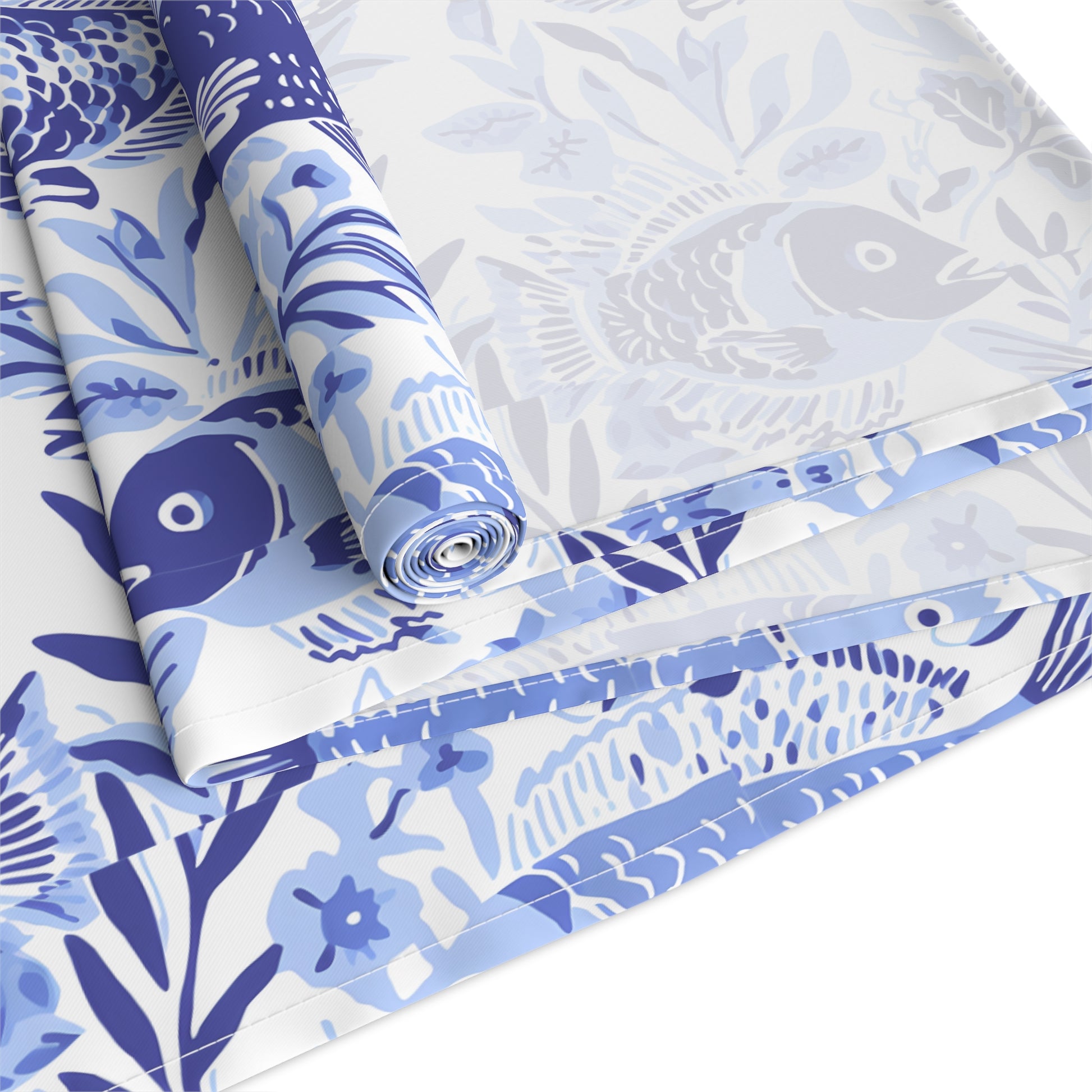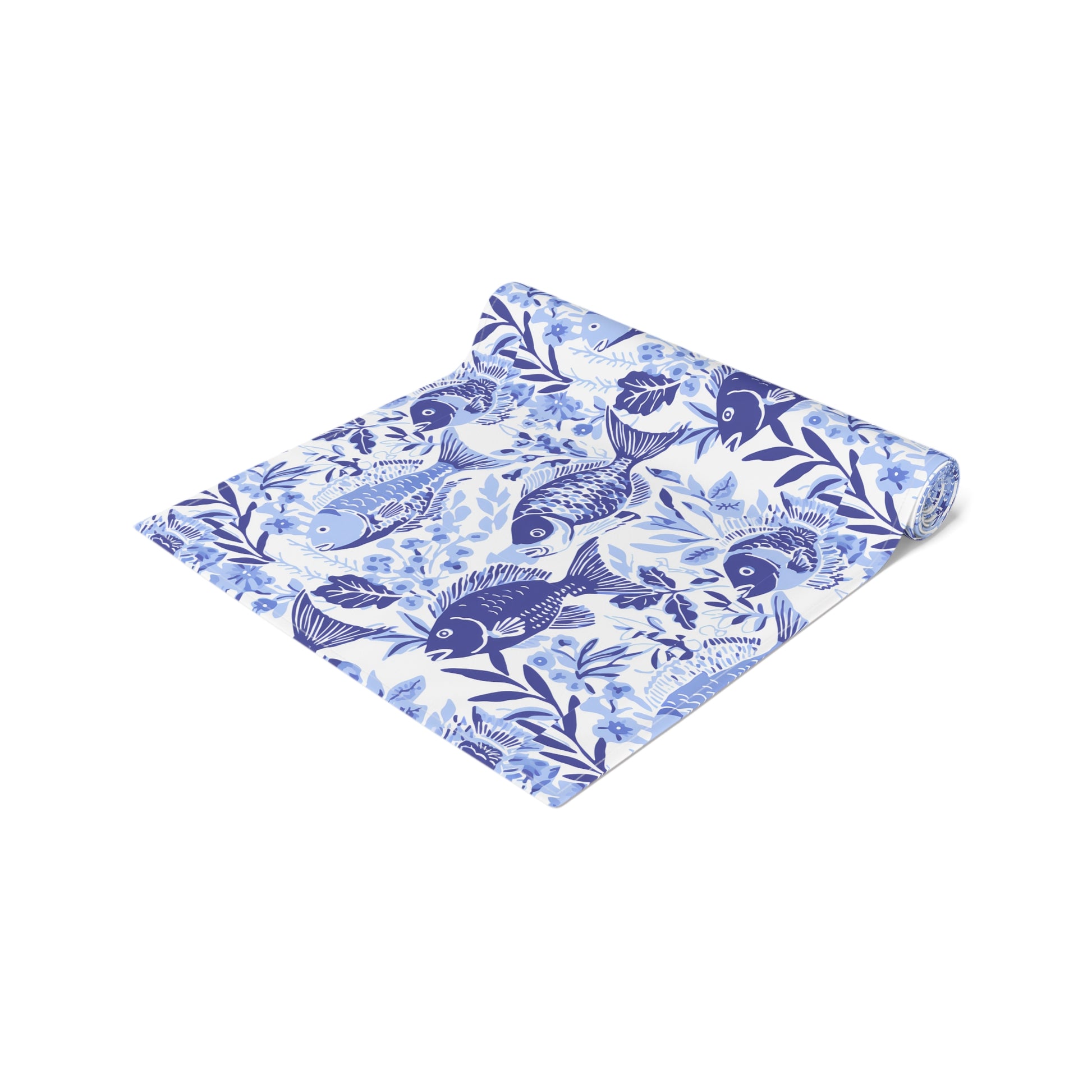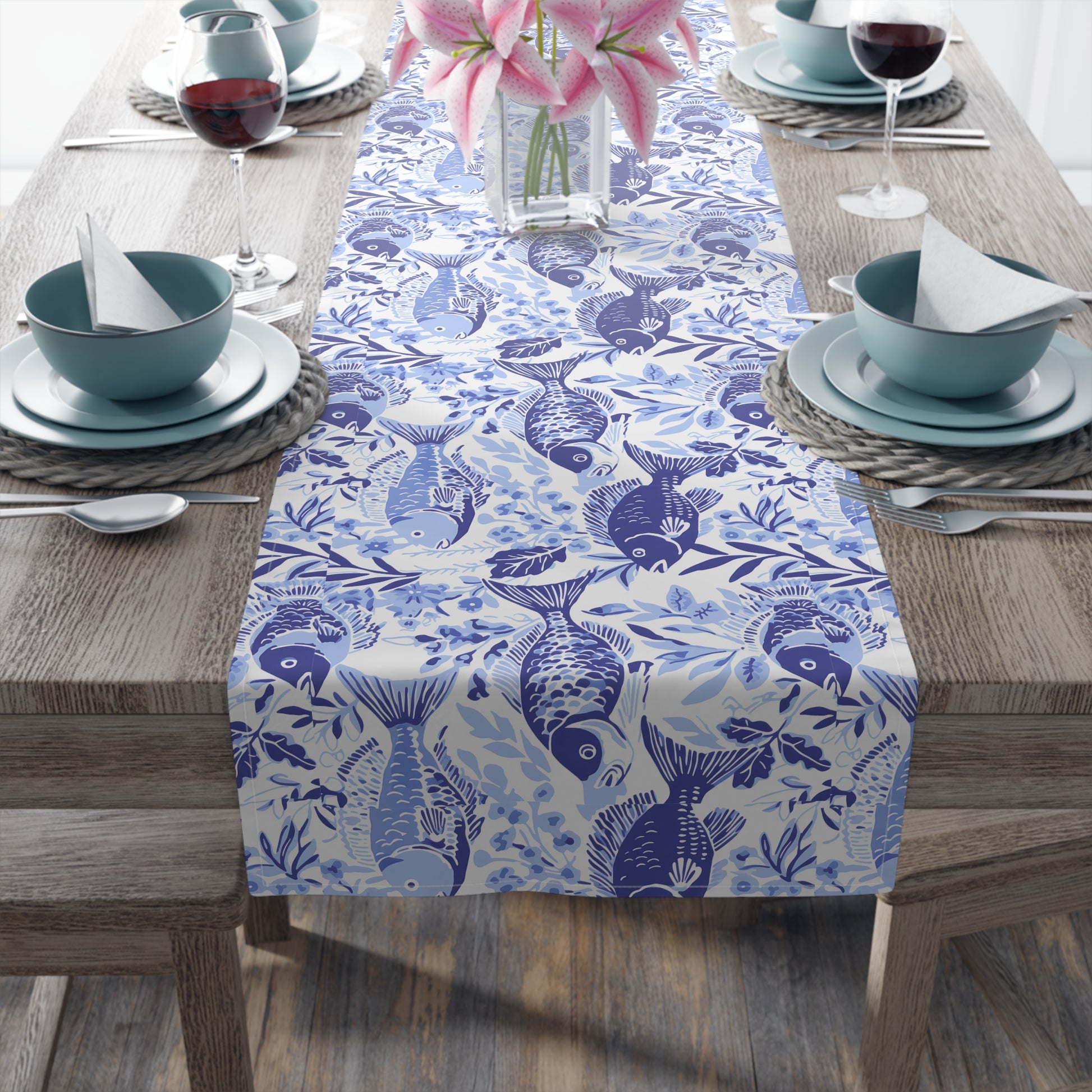 Bring a coastal, hand-painted charm to your dining table with this blue-and-white fish-pattern table runner. The repeating marine motif—delicate fish, seaweed and soft watercolor washes—creates a calm, nautical mood that feels both vintage and fresh. Use the longer size for a dramatic centerpiece down a farmhouse or banquet table, or the shorter length for casual breakfasts and weekday dinners. The cotton twill for a softer, more classic matte look. Hemmed edges add a tailored finish that sits neatly beneath serving dishes and vases. This runner sets the scene for slow mornings with sea-salted air, easy coastal dinners, and gatherings that lean into relaxed, layered table styling.