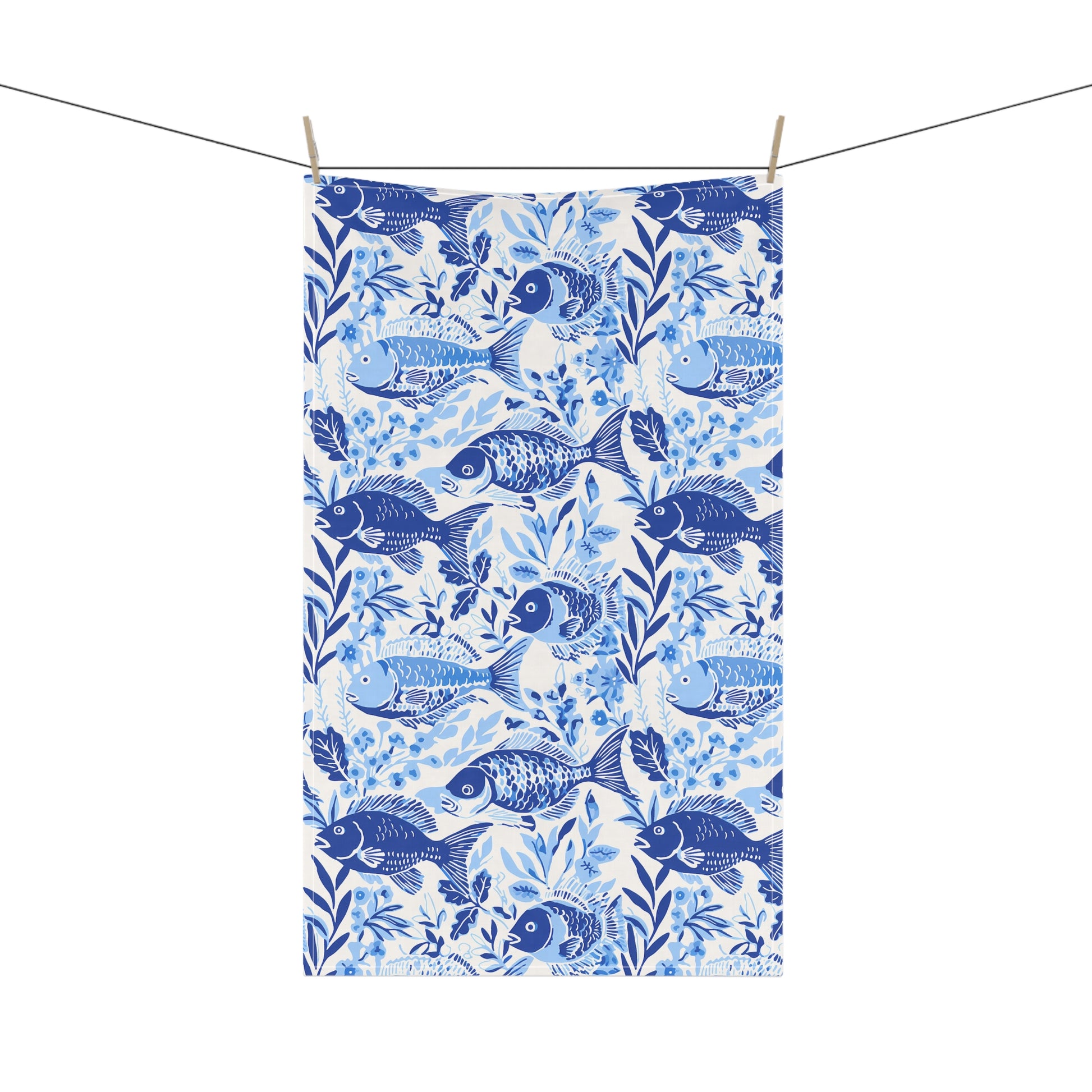 Blue Fish Pattern Tea Towel — Coastal Kitchen Cotton-Blend Dish Towel