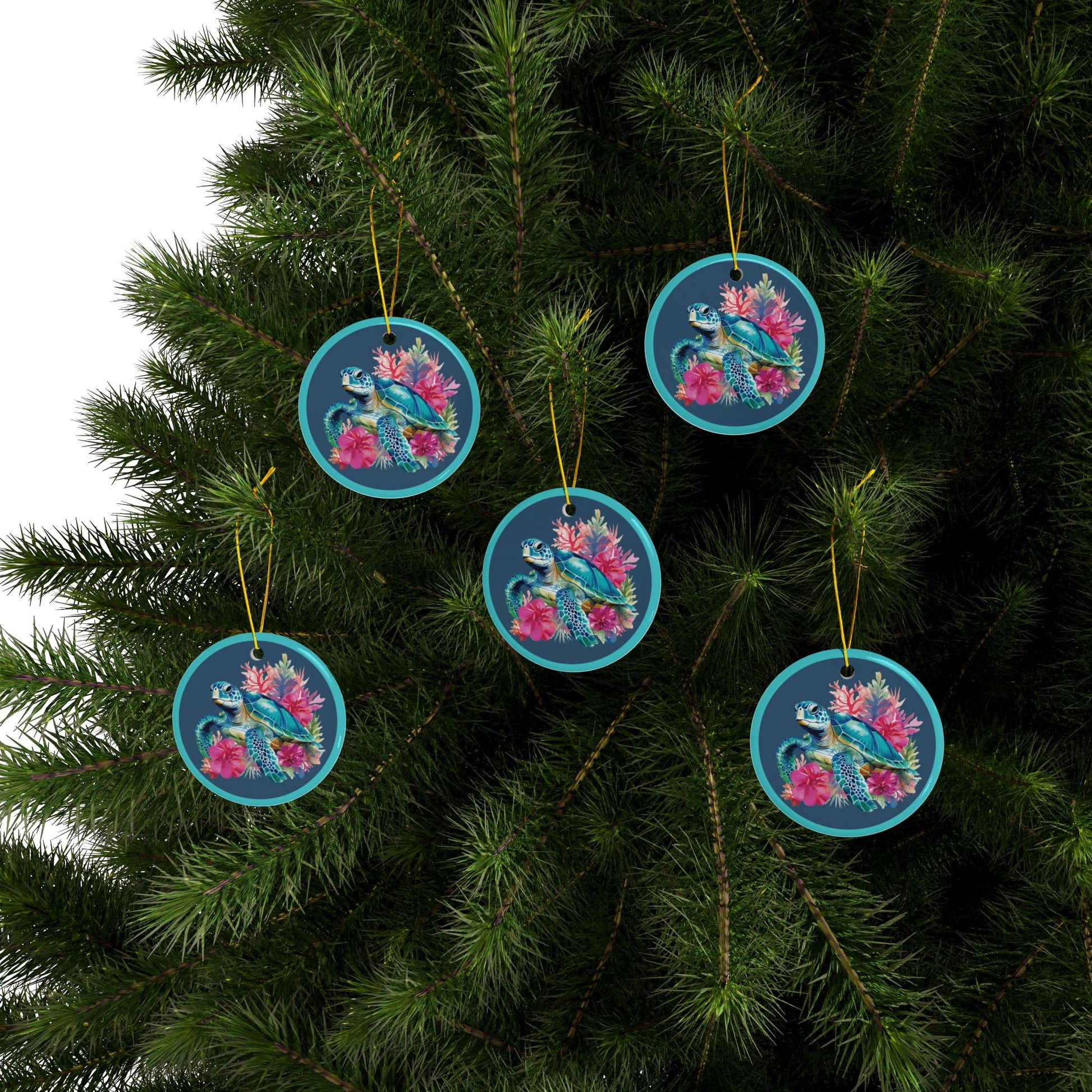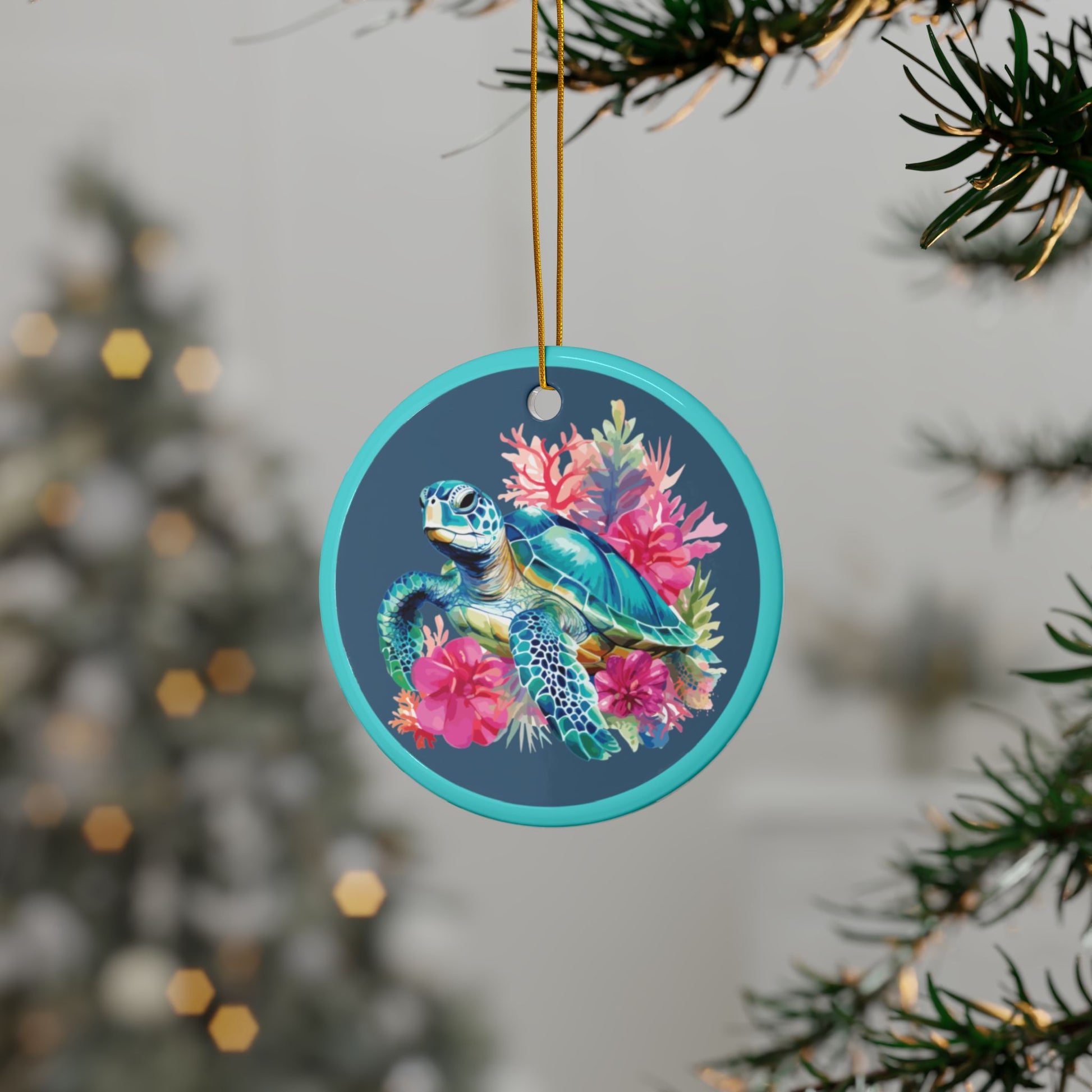 Sea turtle coastal Christmas Ornament. Made of durable ceramic, this ornament features a two-sided sea turtle print.