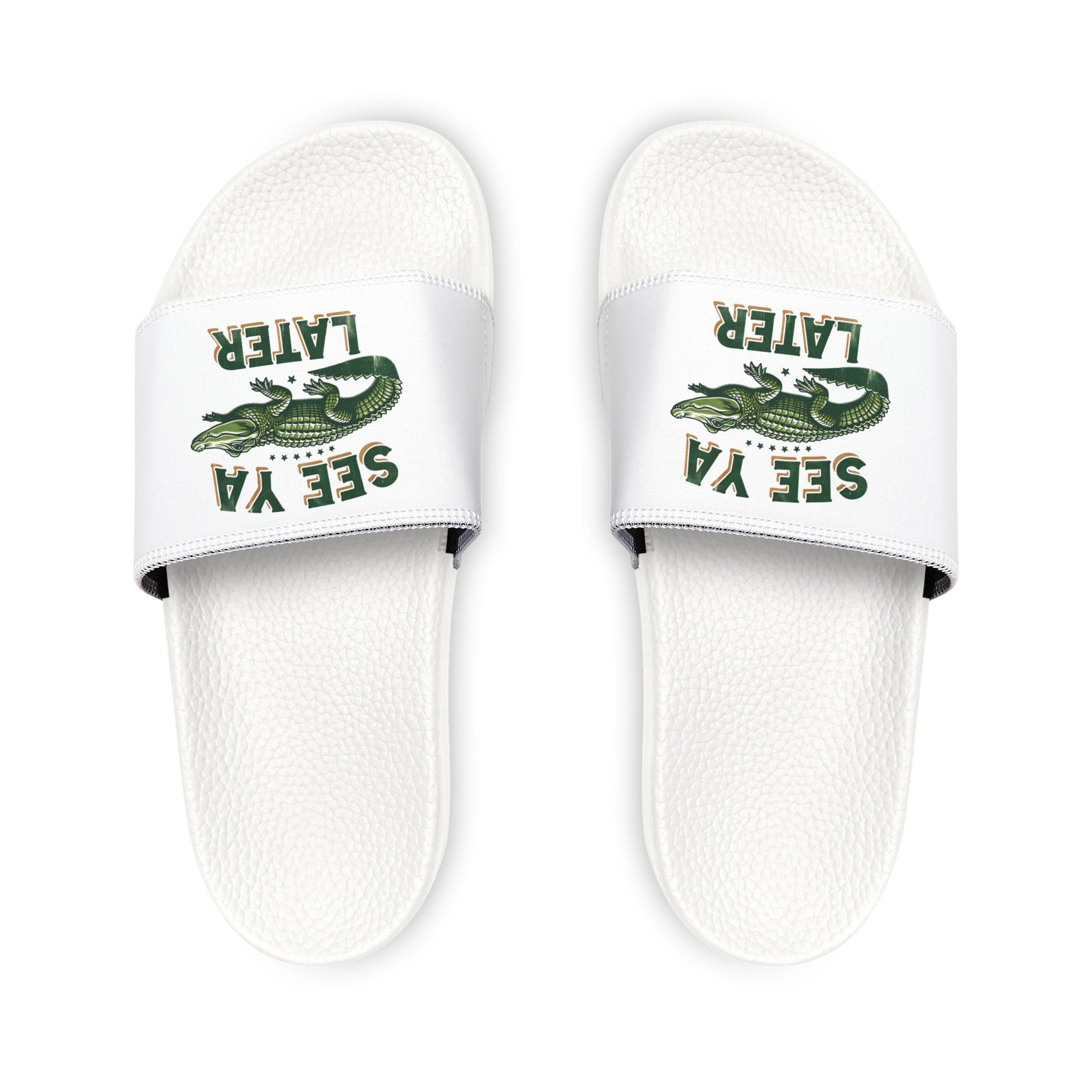 Slide Sandals — White ‘See Ya Later’ Alligator Crocodile Graphic