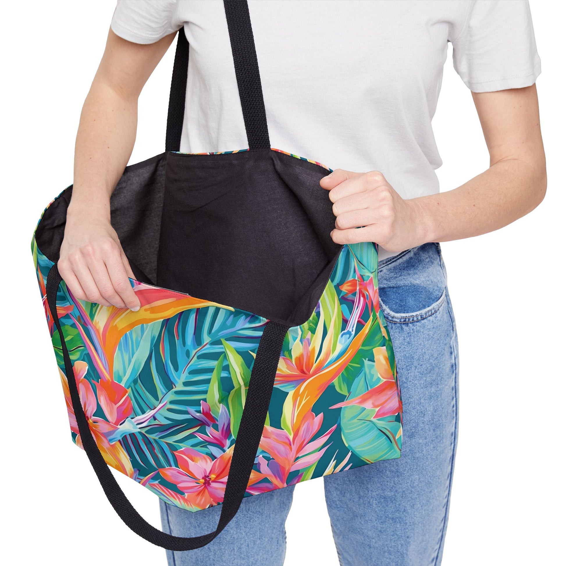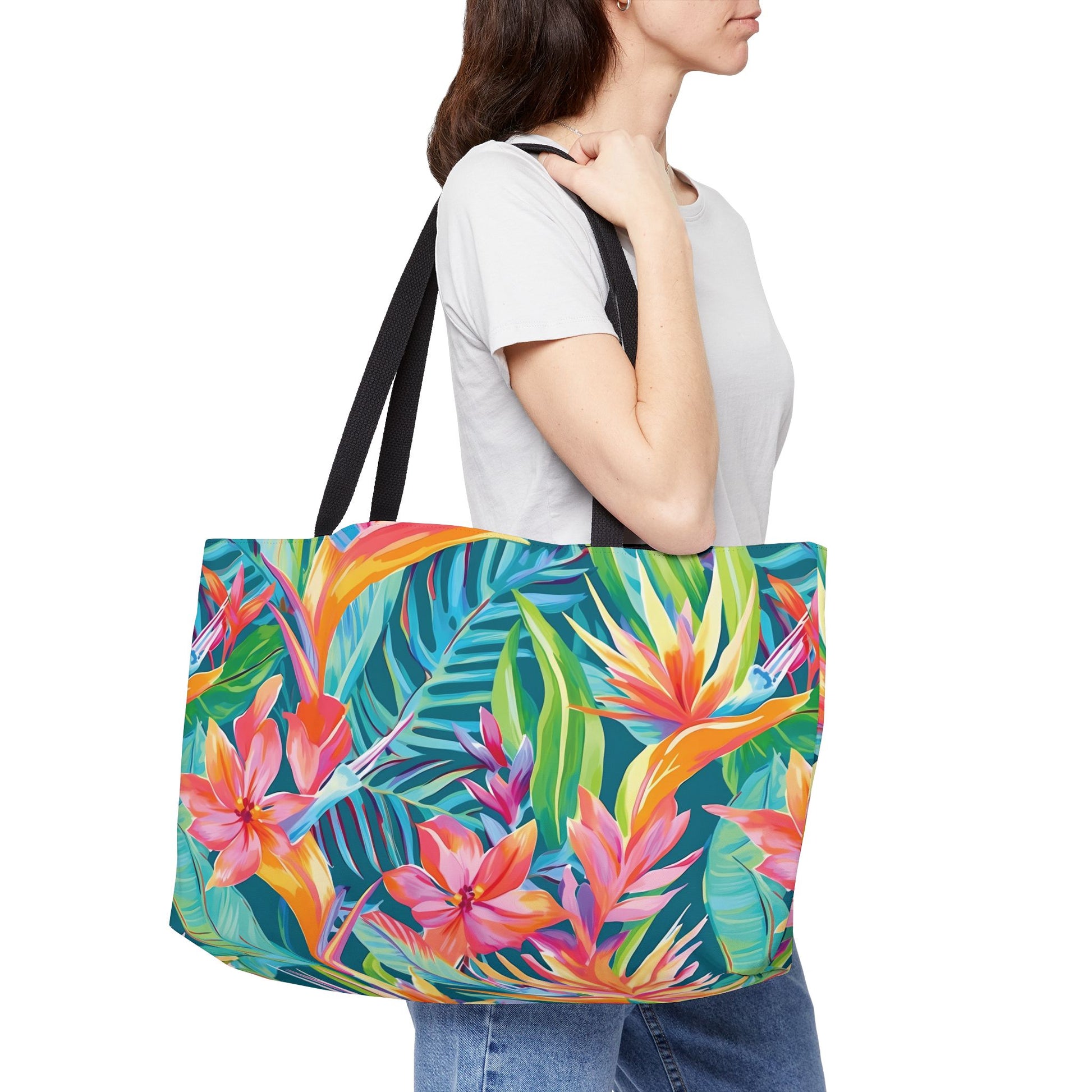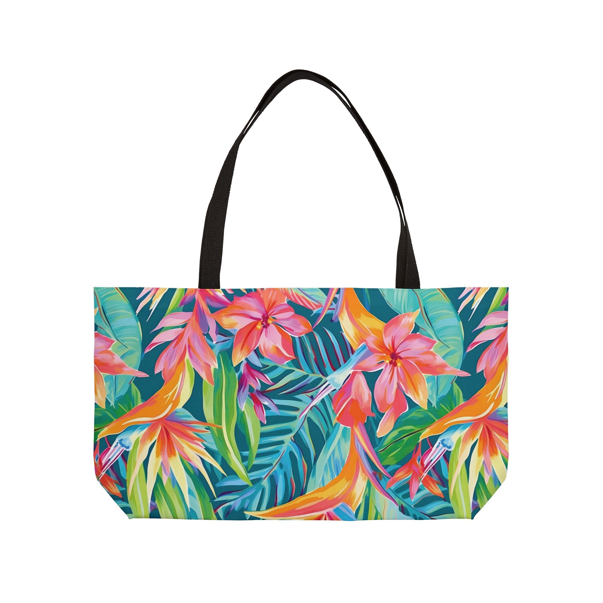 Elevate your travel game with this vibrant Weekender Tote Bag, expertly designed for both style and function. Featuring a stunning tropical print, this bag brings a burst of color and energy, perfect for beach days, weekend getaways, or a stylish everyday companion. The spacious interior allows you to pack everything you need, while the durable black handles ensure easy carrying. Ideal for adventurers, fashionistas, and anyone who loves to add a splash of personality to their outings. This bag is perfect for summer vacations, beach trips, and casual outings, making it a thoughtful gift for birthdays and holidays, or simply a treat for yourself.